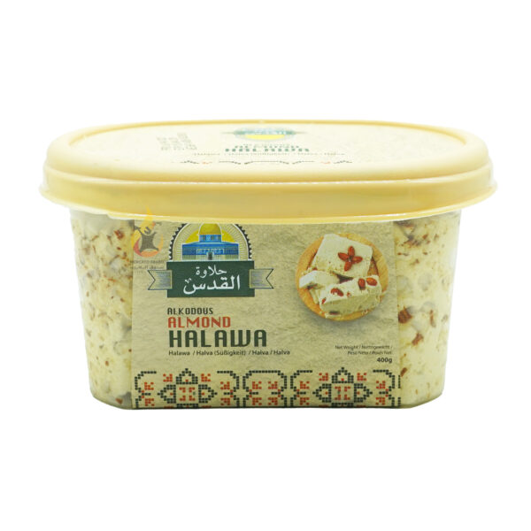 Scopri la Halawa alle Mandorle di Al Kodous, disponibile in un pratico formato da 400 gr. Questa deliziosa Halawa combina la tradizionale dolcezza del sesamo con l’aggiunta di mandorle croccanti, creando un equilibrio perfetto tra cremosità e consistenza. Ogni boccone è un’esplosione di sapori, che porta con sé la qualità e l’autenticità di una ricetta storica, arricchita dalla sapienza artigianale di Al Kodous.